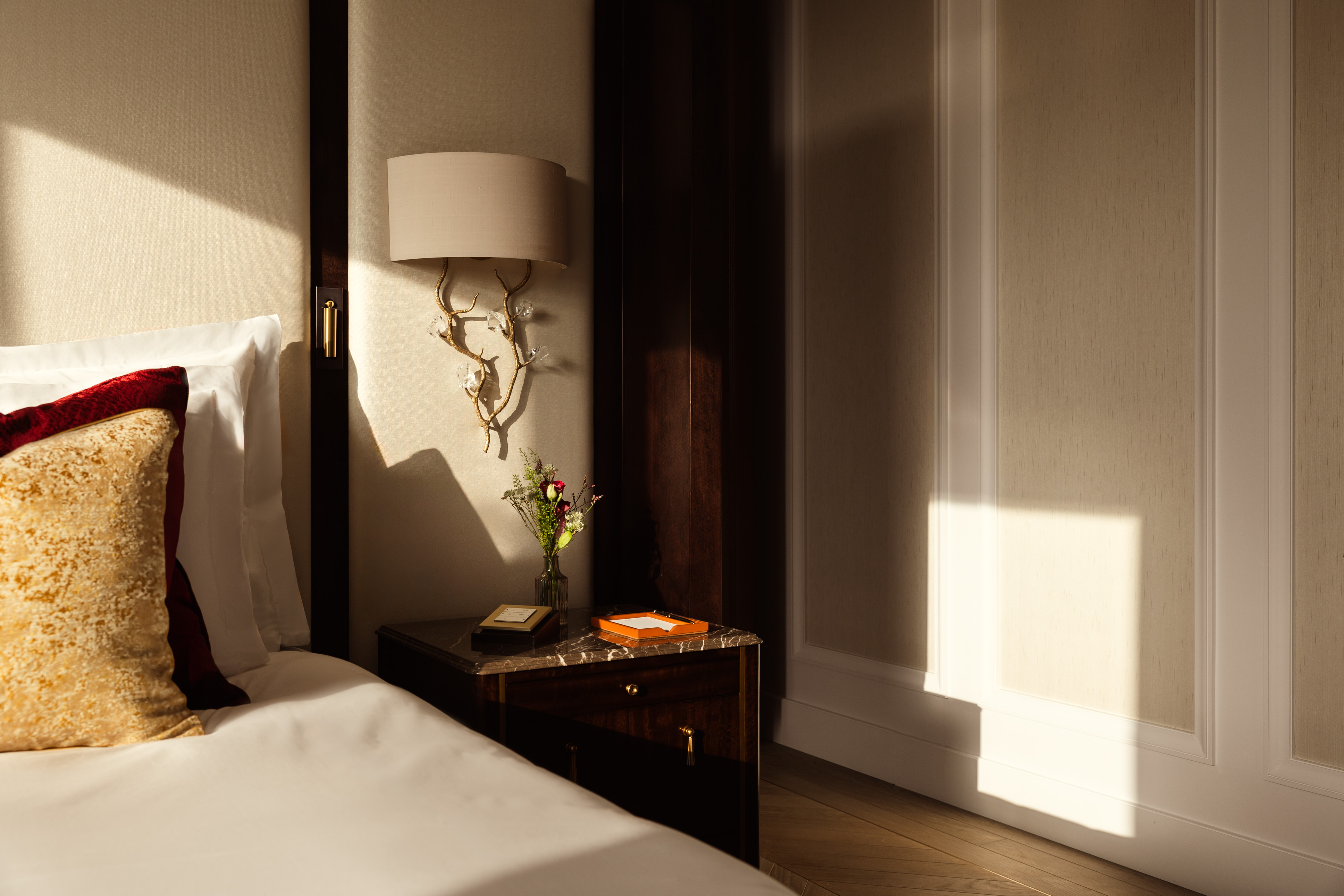 Soft, natural tones and warm wood panelling frame elegant silk wallcoverings and bespoke marble inlays, while subtle accents of sage and floral motifs bring an air of organic sophistication.