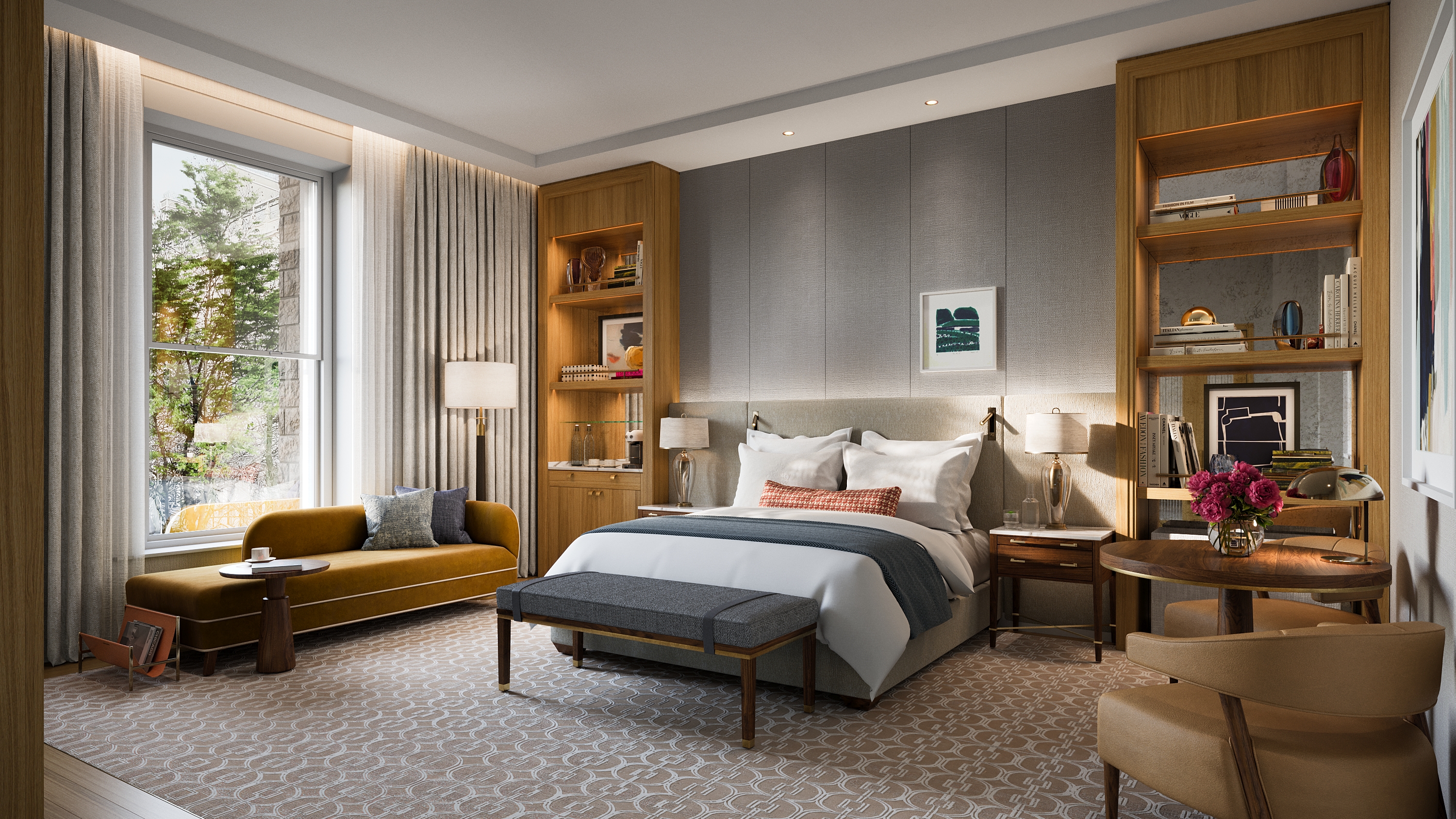 Reimagined for modern elegance, the Whitehall Suite nods to British heritage with a fresh twist. Rich golden hues and deep reds set a sumptuous stage while Hector Finch’s artisanal brass lighting and hand-finished timber bring out the suite's charm. Every element speaks to refined taste, making this a retreat you’ll long to return to.